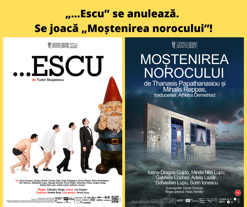 Reprezentația spectacolului „...Escu”, programată în data de 31 ianuarie, se anulează din motive medicale. Vestea bună este că în locul acesteia se va juca spectacolul „Moștenirea Norocului”, tot de la ora 18:00, la Sala Mare. Biletele deja achiziționate pentru „...Escu” sunt valabile pentru „Moștenirea norocului”.