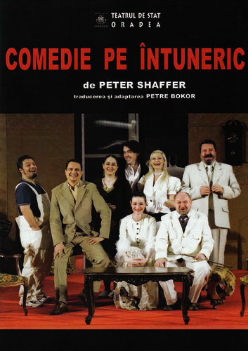 Scrisă în buna tradiţie a farsei, „Comedie pe întuneric” poate fi considerată una dintre cele mai amuzante piese de teatru aparţinând celei de-a doua jumătăţi a secolului al XX-lea. La momentul scrierii sale şi a primei puneri în scenă, la Chichester Festival, în 1965, „Comedie pe întuneric” a reprezentat o inovaţie semnificativă a limbajului teatral vestic, prin convenţiile scenice folosite. Cu toate acestea, inovaţia introdusă de Peter Shaffer în spaţiul occidental este regăsibilă în vechiul teatru chinezesc şi se bazează pe inversarea semnificaţiilor luminii şi a întunericului O banală pană de curent produsă într-o seară de duminică de o importanţă vitală pentru protagonişti, deviază întreaga derulare a evenimentelor pregătite cu grijă şi migală de aceştia. Sculptorul Brian Miller şi logodnica sa, Carol, au pus la cale o întâlnire cu scopul de a-i impresiona pe tatăl lui Carol, fost militar de carieră, şi pe milionarul Georg Bamberger, care, speră ei, va cumpăra din operele de artă create de Brian, asigurându-i acestuia faima şi stabilitatea materială. Lucrurile nu decurg însă nici pe departe aşa cum fuseseră plănuite, fiindcă în întunericul care se lasă brusc peste personaje, confuziile şi surprizele se ţin lanţ, culminând cu apariţia fostei logodnice a lui Brian.
