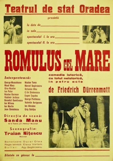 În „Romulus cel Mare”, Friedrich Dürrenmatt falsifică în mod intenţionat istoria: ultimul împărat al Romei, Romulus, nu este împăratul-copil cunoscut de istorie, ci un filosof sceptic, care destramă conştient imperiul. În timp ce în jurul lui lumea antică agonizează, el îşi găseşte un rost în creşterea găinilor, pe care le botează cu numele ultimilor împăraţi romani (găina purtând numele lui Odoacru – cuceritorul vizigot- este cea mai productivă în ouă). Ani de-a rândul el face pe bufonul şi nimeni din anturajul său nu realizează că această extravaganţă este, de fapt, o metodă. Evenimentele şi figurile istorice sunt modernizate şi bagatelizate într-o manieră ce aminteşte de G.B. Shaw şi contribuie la demontarea locurilor comune ale gândirii istorice şi ale literaturii. Conform acestora, prăbuşirea unui imperiu capătă neapărat conotaţii tragice. Dimpotrivă, în piesa dramaturgului eleveţian, acest eveniment are chiar valenţe comice, cu ironii subtile la adresa istoriei şi a personalităţilor sale. După cum menţionează autorul însuşi, „Tragismul piesei rezidă în comedia sfârşitului ei: pensionarea lui Romulus de către Odoacru”, conducător lucid care înţelege că odată cu preluarea teritoriilor cucerite, vor fi preluate şi problemele imperiului învins şi că noua lui putere va fi şi ea măcinată şi condamnată. Pe orizontul istoriei îşi face deja apariţia Theodoric.