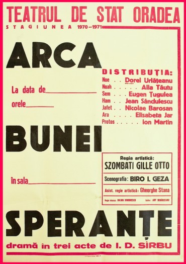 „Arca bunei speranţe” întreprinde, în termenii arhetipali ai parabolei convertite în expresie teatrală, o meditaţie asupra destinului omenirii, aflate pe arca simbolică a propriei sale istorii. Corabia lui Noe pluteşte singură, pierdură în hula şi în noaptea fără margini.Legenda biblică devine pretext pentru a înfăţişa mobilurile profunde care pun în mişcare energiile istoriei: lupta eternă dintre speranţa în viitor şi forţele întunericului, ale orgoliului, setea de dominaţie, disperarea neputincioasă. Personajele piesei reprezintă câte una din taberele aflate în conflict. Sem este forţa obscură, elementară, întemeiată pe principiul dreptului celui mai puternic; Ham întruchipează dezumanizarea acelei părţi a ştiinţei moderne al cărei scop nu este fericirea omenirii, ci supremaţia asupra universului; Jafet, fratele cel mai mic caută un semn pozitiv, o legătură cu umanitatea, o lume posibilă. Apariţia femeii Ara, investită cu virtuţile născătoarei de umanitate, stârneşte vrajbă, iscă patimi şi ambiţii latente până atunci. În cele din urmă, Noe şi perechea lui, Bătrâna, se sting, cei doi fraţi ai ambiţiilor deşarte pier şi ei, rămânând numai Ara şi Jafet, întruchipând speranţa într-o lume viitoare. Încărcatura filozofică a piesei sugerează că frumuseţea, înţelepciunea, omenia, iubirea sunt valori care există şi rămân pentru a germina mai departe în spaţiul dat al corăbiei ce simbolizează lumea.