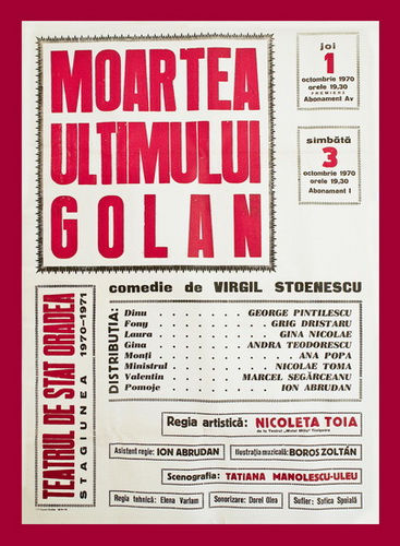 „Nu cunosc nimic mai tulburător, mai contradictoriu, mai incert şi mai insolit decît ființa în continuă frămîntare a omului tînăr. Ard într-însul mii de întrebări, de visuri şi ambiții grandioase. Clocotesc într-însul imense energii potenţate, care stau gata să explodeze în isprăvi prometeice, unice, uluitoare — uneori deconcertante, alteori reprobabile — dar întotdeauna înnobilate de prețul uriaş aruncat — cu o inconştientă generozitate — de către acest tînăr în balanţă şi care este propriul lui destin, propria lui viață. Un asemenea personaj este Dinu, eroul comediei mele „Moartea ultimului golan”. De fapt personajul acesta poartă o emblemă falsă. Dinu nu e golan. El se joacă de-a golănia. O arborează ca pe un fel de blazon nobiliar. Sub acest blazon se ascunde însă o nemărturisită seriozitate. Nemărturisind-o, Dinu se defineşte ca un timid. Şi nu de puține ori asemenea oameni îşi convertesc timiditatea într-un cinism foarte bine disimulat. Desigur că Dinu plăteşte un greu tribut firii sale superficiale şi ariviste. Poate e prea grăbit să găsească un răspuns la complicatele întrebări pe care viața le pune înaintea unui tînăr. Poate metodele la care recurge ca să-şi ajungă scopul sînt potrivnice eticii societăţii noastre. Dar măcar un singur lucru nu i se poate contesta eroului meu: curajul sincerităţii! O sinceritate crudă, dureroasă, atunci cînd omul este confruntat cu propriile lui greşeli.” (Virgil Stoenescu în caietul-program al spectacolului)