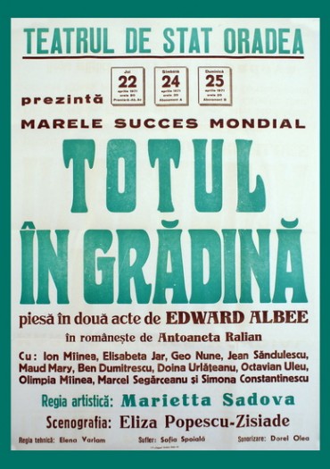 Debutul piesei „Totul în grădină” (plasată la sfârşitul anilor 1960, într-o suburbie americană obişnuită) este realizat în stilul comediei de moravuri şi aduce în prim-plan cuplul Jenny şi Richard, preocupaţi de problema fiecărui om de rând: prea multe facturi de plătit şi bani insuficienţi pentru a o face. În continuare, însă, piesa ridică numeroase întrebări grave: cât de departe este dispus omul să meargă pentru a obţine aceşti bani? Cu ce preţ? Eşti dispus să îţi foloseşti trupul? Dar trupul apropiaţilor tăi?