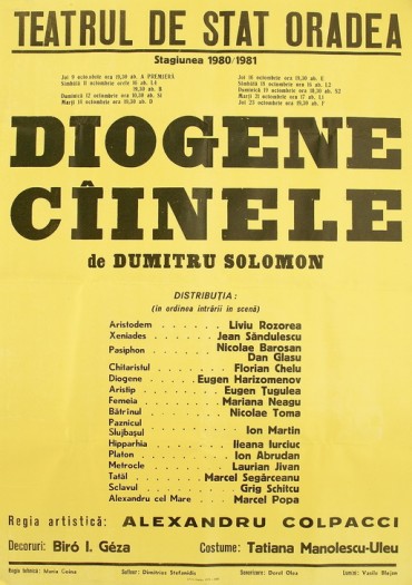 Piesa „Diogene câinele” împreună cu „Platon” şi “Socrate”, alcătuiesc o trilogie ce face parte dintr-o serie intitulată de autor „Măşti contemporane”, prin care urmărea transpunerea dramatică a unor simboluri, semne şi idei ale existenţei morale. O piesă precum „Diogene câinele” se îndepărtează de ideea de „biografie filosofică”, „viaţă sentimentală” sau „destin exemplar” şi devine o metaforă a omului universal şi contemporan, frământat de dilemele perene ale existenţei. După cum remarcă Valeriu Râpeanu în caietul-program al spectacolului, piesa poate fi asociată teatrului de idei, în descendenţa lui Camil Petrescu. Ca şi în teatrul acestuia, în centru stă intelectualul în relaţia sa cu formele instituţionalizate ale puterii; confruntarea în momentele de maxim tragism se dă în câmpul ideilor. În piesa lui Dumitru Solomon, ideea – în acest caz ideea de libertate – capătă o existenţă şi o funcţie concretă. Considerat printre întemeietorii şcolii filosofice cinice, Diogene a trăit într-o Atenă ce nu mai păstra decât amintirea faimoaselor sale principii democratice. Afişându-şi fără rezerve adversitatea faţă de conducători (e câinele ce muşcă mâna ostentativ milostivă care îi întinde osul indispensabil traiului), Diogene îşi