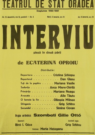 Piesă cu caracter polemic, „Interviul” îşi extrage substanţa dintr-o temă pe care autoarea Ecaterina Oproiu a tratat-o şi în volumul de reportaje „3 x 8 plus infinitul”: condiţia femeii în societatea contemporană. Pretextul dramatic este o emisiune festivă de 8 martie, ce se pregăteşte pe platourile televiziunii, transformându-se într-un adevărat duel existenţial între Reporter şi Reporteră. Inteligenţi, ageri, pasionaţi de profesia lor, patimaşi, cei doi ajung până în pragul unei drame a separării cauzate de diferenţele de principii. Egalitatea în drepturi a femeii cu bărbatul, consfinţită prin lege, nu se manifestă în toate circumstanţele vieţii. Care sunt, în continuare, atributele feminităţii?