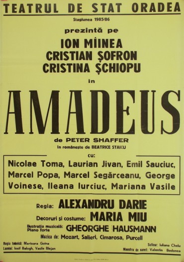 În „Amadeus”, Peter Shaffer combină istoria și ficțiunea pentru a prezenta aspecte ale ultimilor ani de viață ai lui Wolfgang Amadeus Mozart. Piesa explorează rivalitatea dintre Mozart și Antonio Salieri, compozitorul curții Împăratului Austriei la sfârșitul secolului al XVIII-lea. Invidiind talentul tânărului Mozart și nefericit din cauza propriei mediocrități, Salieri nu poate înțelege cum Dumnezeu a oferit un asemenea har incredibil excentricului Mozart, după cel el însuși a încheiat un „pact” cu Divinitatea. El îl reneagă pe Dumnezeu și plănuiește să își distrugă rivalul pe toate căile posibile. În forul interior al lui Salieri, invidia se combină cu admirația, aproape dragostea pentru muzica lui Mozart. Salieri înțelege mai bine decât oricine calitățile excepționale ale muzicii lui Mozart, iar acest amestec de ură și apreciere face din el unul din cele mai complexe personaje ale dramaturgiei universale. De asemenea, deși poartă numele lui Mozart (Amadeus – cel iubit de Dumnezeu), istorisirea se face din unghiul lui Salieri, bătrân și pregătindu-se de moarte, ilustrând intoleranța, dar meditând la genialitate.