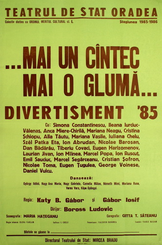 Spectacolul „Mai un cântec, mai o glumă… Divertisment ’85” a propus spectatorilor o nouă întâlnire cu umorul, prin momente artistice muzicale, coregrafice şi de pantomimă, ca şi printr-o serie de scenete comice precum: „La Filarmonică” „Tratament în staţiune”, „Ce proşti sunt soţii!”, „Cecitate”, „La curăţătoria chimică”, „Ciupercile”.