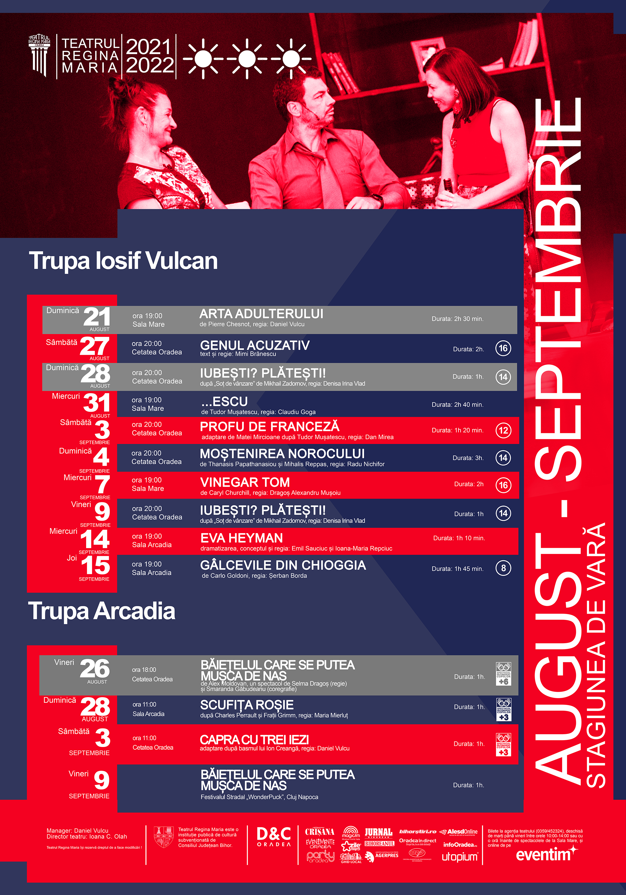 Teatrul Regina Maria anunță un program captivant pentru luna aprilie, oferind publicului orădean o serie de spectacole de excepție, printre care se numără premiere, piese clasice reinterpretate și producții contemporane.