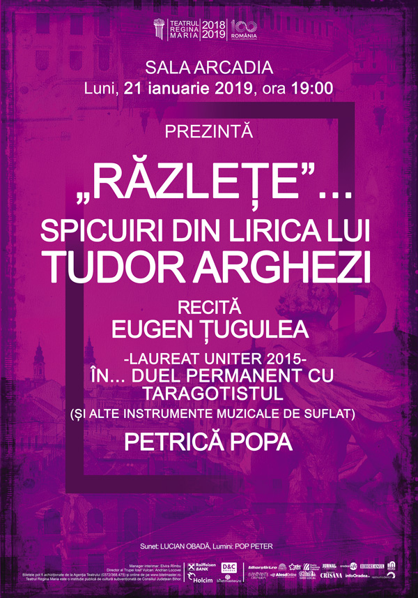 Recitalul este susținut de actorul Eugen Țugulea, laureat UNITER în anul 2015 și are menirea de a conserva și de a readuce, în același timp, în atenția publicului orădean, opera unuia dintre cei mai prolifici și îndrăgiți poeți români: Tudor Arghezi. Glasul reputatului actor va fi acompaniat de sunetele instrumentelor de suflat mânuite cu pricepere de Petrică Popa.