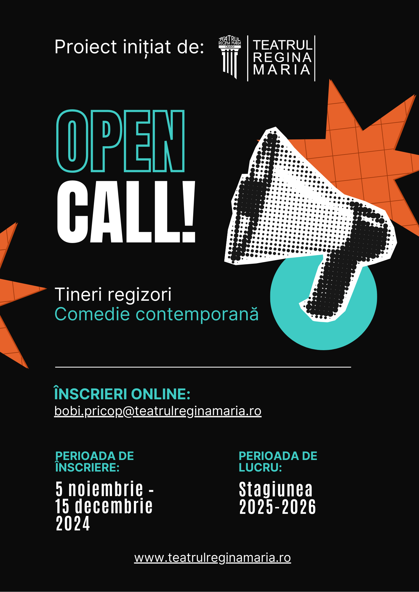 Teatrul Regina Maria lansează un Open Call adresat tinerilor regizori din România care sunt pasionați de comedie contemporană. Căutăm propuneri originale de comedii, care să reflecte realitățile și provocările actuale, explorând teme relevante pentru publicul de azi, într-o manieră creativă, amuzantă și inovatoare.